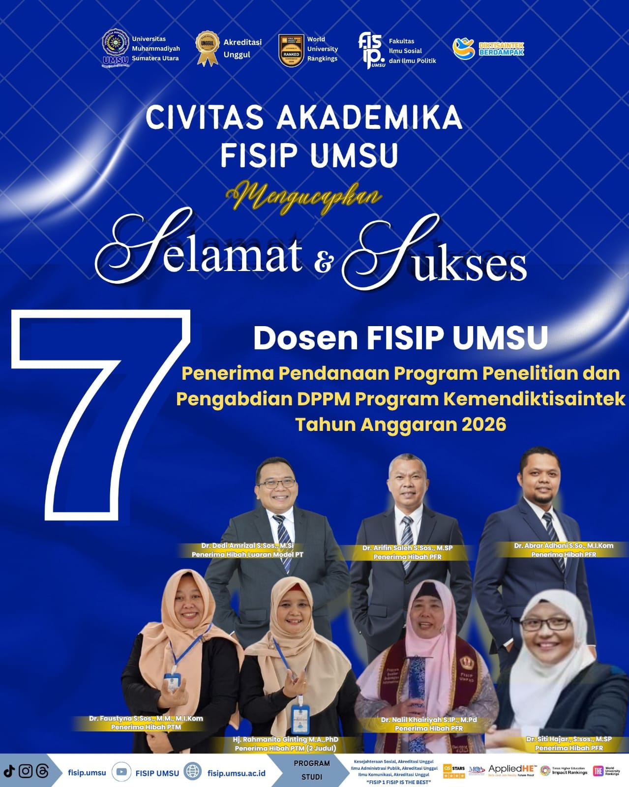 Sebanyak 7 (tujuh) dosen dari Fakultas Ilmu Sosial dan Ilmu Politik (FISIP) UMSU berhasil lolos sebagai penerima dana hibah penelitian dari Kementerian Pendidikan Tinggi, Sains, dan Teknologi (Kemendiktisaintek) tahun 2026. Pengumuman tersebut secara resmi dirilis pada 11 April 2026.